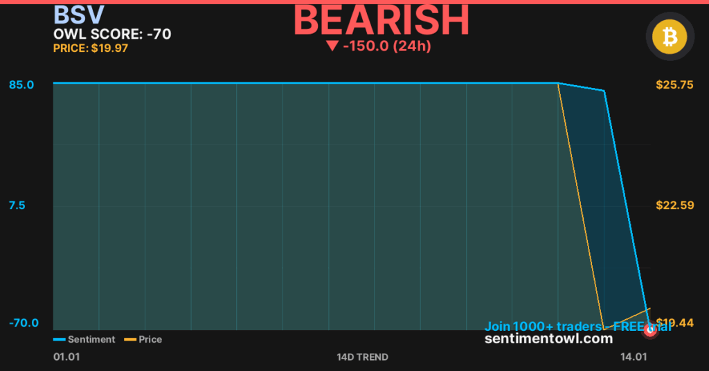 BSV sentiment sees sharp pullback, caution advised. UK Supreme Court case appeal shut down. Are risks mounting? sentimentowl.com $BSV #crypto #alert #trading