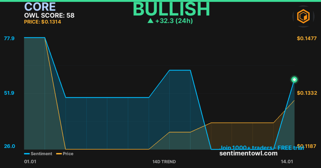 CORE's momentum is on fire! 🚀 Owl Score soared from 26 to 58.33 🔥 Can it reach new heights? 🌟 Don't miss out! sentimentowl.com $CORE #crypto #alert #sentiment