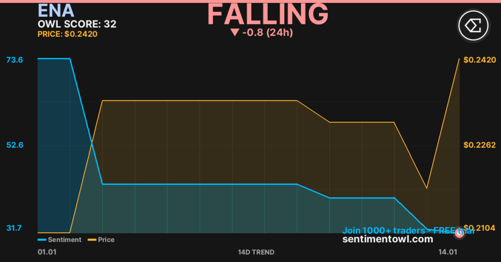 Despite new partnerships, ENA's Owl Score dropped to 31.67 from 32.5. Will it recover soon? Find out more at sentimentowl.com $ENA #crypto #trading
