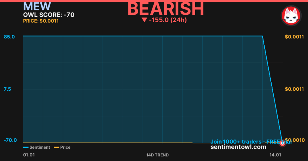 MEW sentiment dips sharply, proceed with caution. MEET48’s 2026 Roadshow unveils new products. Are meme coins worth the risk? Stay informed. sentimentowl.com $MEW #crypto #alert #trading
