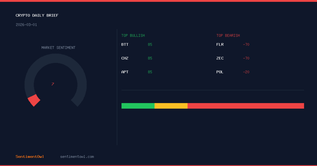 March 2, 2026 5 Market SentimentStrongly bearish15 cryptocurrencies analyzed Today's cryptocurrency market sentiment is strongly bearish, with an overall score of 5.3 out of 100 across 15 cryptocurrencies. This negative…