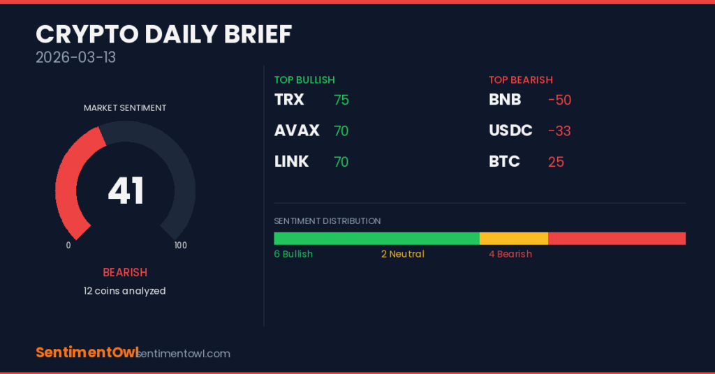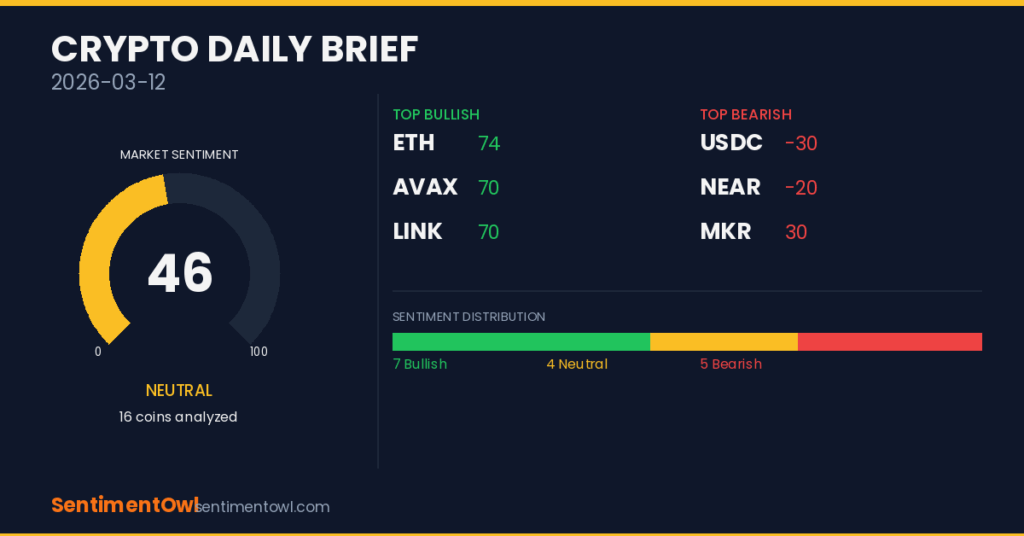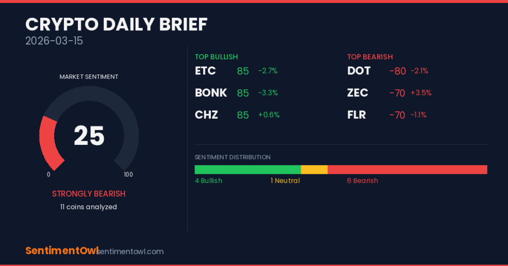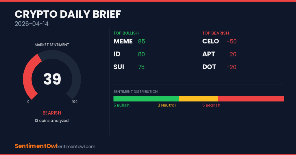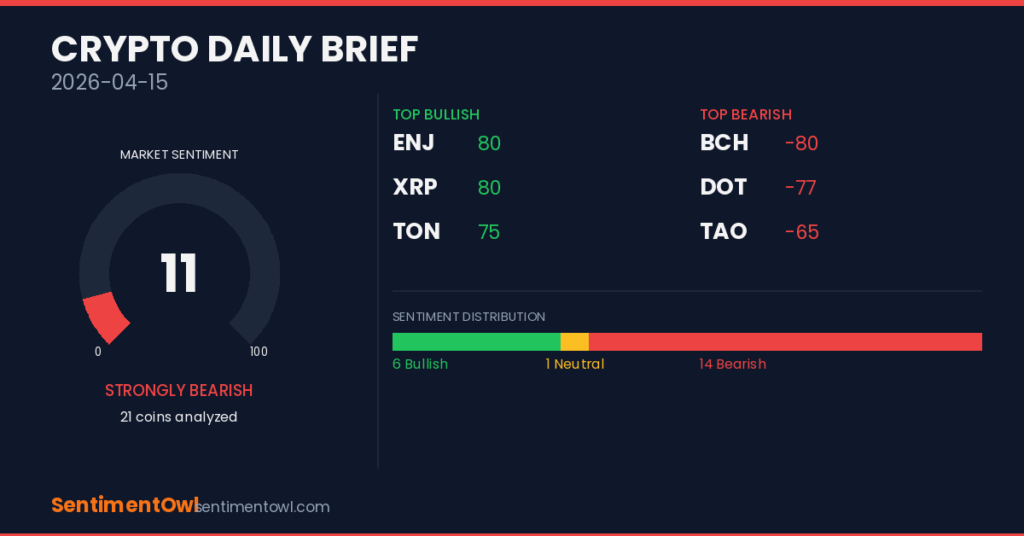 April 16, 2026 32 Market SentimentStrongly bearish14 cryptocurrencies analyzed Today's crypto market sentiment is strongly bearish, with an overall score of 32.2/100 across 14 cryptocurrencies. The market is reeling from…