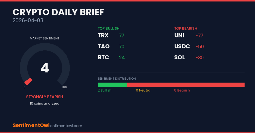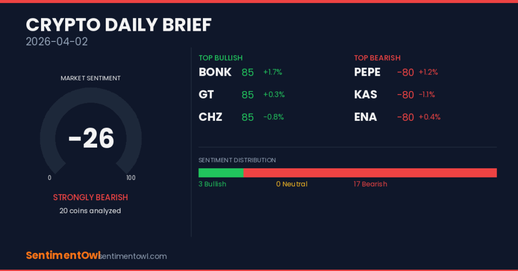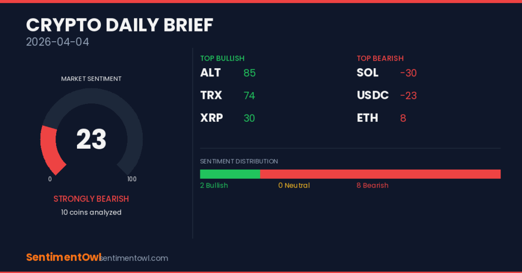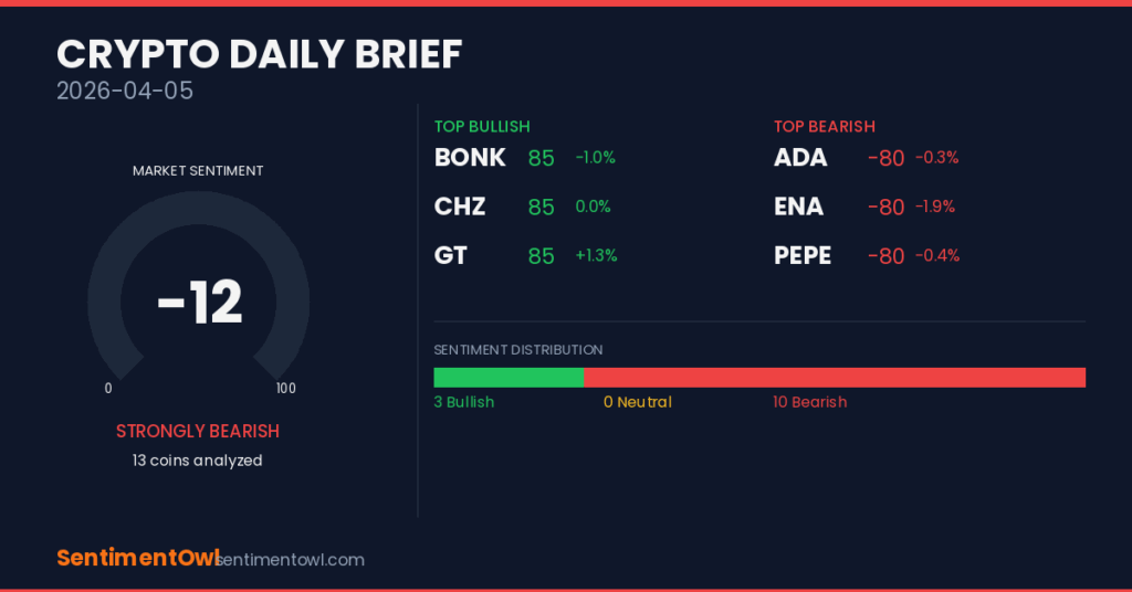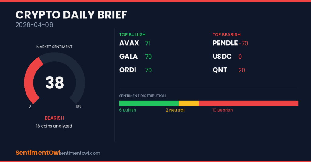April 6, 2026 38 Market SentimentBearish18 cryptocurrencies analyzed Today's crypto market sentiment is notably bearish, with a score of 38 out of 100 across 18 cryptocurrencies. This negative mood is…